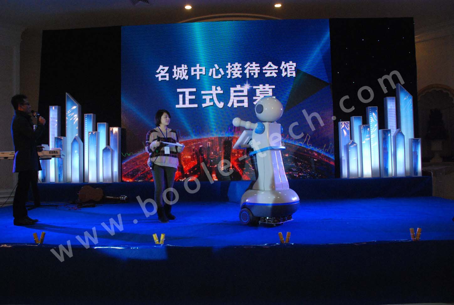 2013年1月12號,福州東方名城中心地產招商儀式啟動,東方名城地產總裁與太空迎賓機器人互動揭開開幕式!
