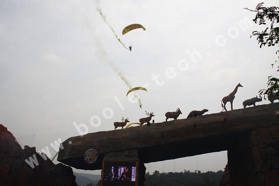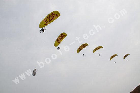 無人機退場后,一輛熱氣球飛艇和一組背著動力傘的“星球戰士”隨之飛抵現場,而同時,另一組“星球戰士”手拉繩索從天而降。