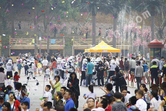 他們手持水槍,發起了對地面的人群發起攻擊,《星球大戰》由此拉開大幕。而孩子們也不甘示弱,他們也拿上自己的最新武器——水槍,勇敢的進行反擊。